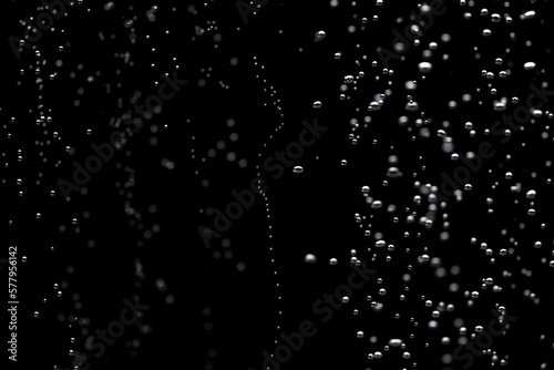 Shiny air bubbles underwater rising from bottom and illuminated by rays of light. Stream of oxygen bubbles on a black isolated background. Close up of a bubbling liquid during aeration of water.