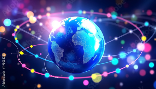 Shiny blue earth with 3d lines and colorful circles around. Technology and global network concept, color sketch, with white tones