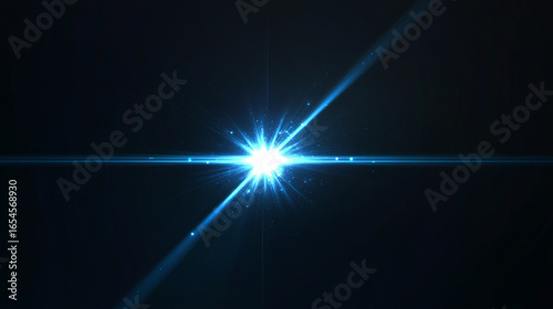 Shiny flare light effect with glowing blue beam star on black background. Futuristic luminous burst, ideal for overlays, digital design, or abstract backdrops.