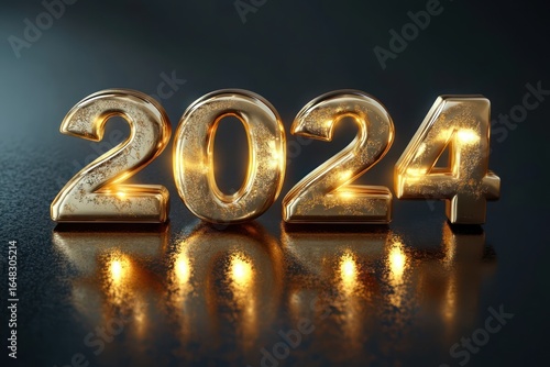 Shiny golden numbers forming 2025 reflecting warm light on dark glossy surface, evoking a festive and hopeful atmosphere for the new year