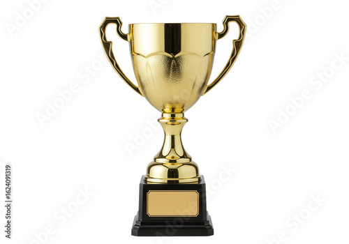 Shiny golden trophy with handles and a blank plate for awards isolated on transparent background