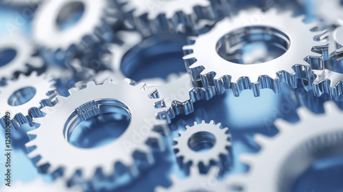 Shiny metal gears in complex arrangement, symbolizing technology and innovation