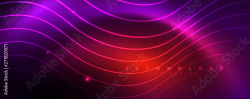 Shiny neon lights, dark abstract background with blurred magic neon light curved lines