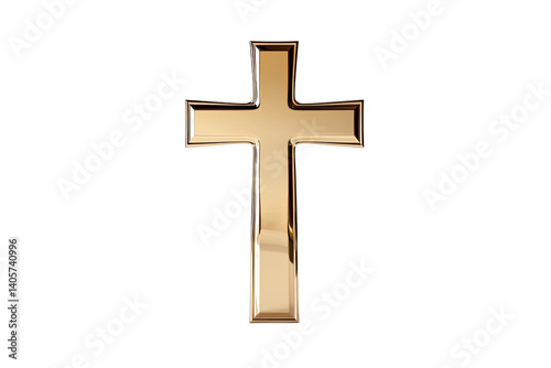 Shiny, polished golden cross centered against a stark transparent background with bright reflections shining on the metal surface