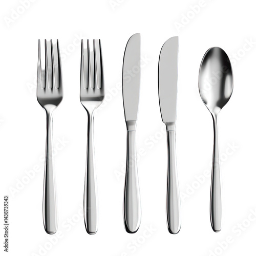 Shiny silver cutlery set isolated on elegant dinnerware 3d fork food tool on transparent background