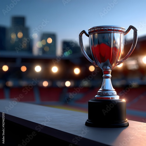 Shiny Silver Trophy on Display at Dusk with Urban Stadium Lights in the Background