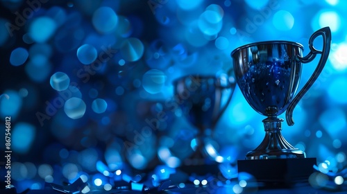 Shiny Trophies Amid Glowing Blue Lights and Glittering Background