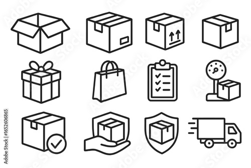 Shipping and delivery service thin line icon set. Logistics and e-commerce concept symbols. Vector collection of package, box, truck, parcel, gift, safe delivery, and checklist.
