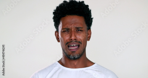 Shock reaction with terror horror and surprise to camera. Black african man portrait upset