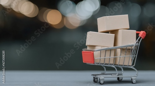 Shoppers Rushing During Black Friday Sales with a Sense of Urgency, Shopping cart filled with boxes against a blurred background of lights.