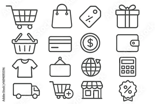 Shopping and e-commerce line icon set. Editable stroke vector pictograms. Includes cart, bag, delivery, payment, and discount symbols for online store, UI, UX, and web design.