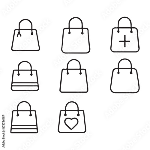 Shopping Bag Icon Set Minimalist Design for E Commerce Retail and Online Store Promotions Featuring Heart Plus and Stripe Accents