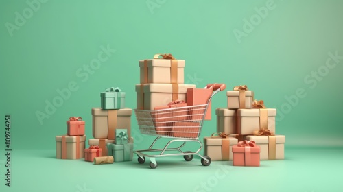 Shopping basket with bags and boxes on green wall background. 3d illustration. AI generated image