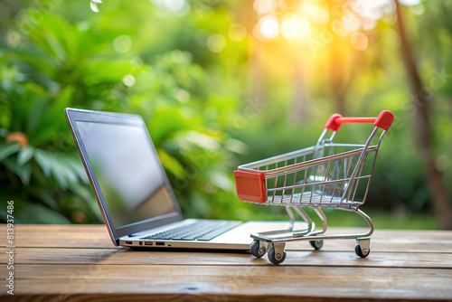 Shopping cart and laptop on wooden table with blurred background. Ecommerce, Purchase, Digital.