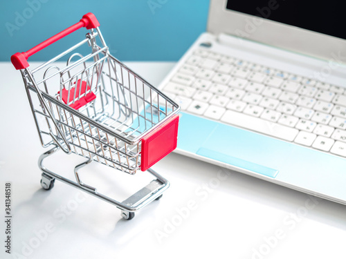 Shopping cart and portable computer. Safe and online shopping on coronavirus quarantine concept. Blue and white background, top view.