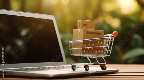 Shopping cart on computer keyboard. The concept of mail order internet e-commerce market