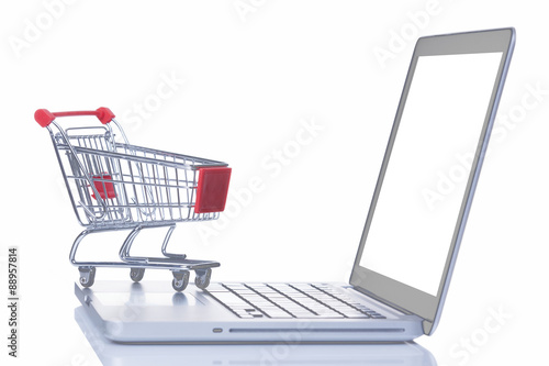 Shopping cart over a laptop computer, isolated on white backgrou