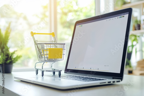 Shopping cart standing on laptop keyboard with white screen on desk in brightly lit room