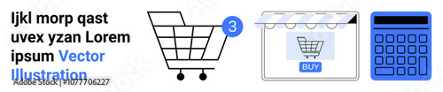 Shopping cart with item count, storefront window with a buy button, and blue calculator. Ideal for illustrating online shopping, e-commerce, digital transactions, retail business, website interfaces
