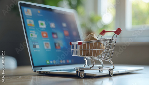 Shopping cart with laptop. AI Generated