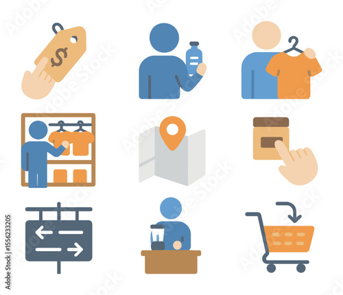 Shopping Icon Set. Flat icon set of in-store decision-making: price tag check, product label reading, trying