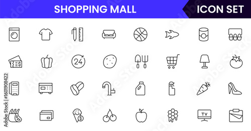 Shopping mall vector line icons featuring shopping carts, aisles, products, shelves, checkout counters, baskets, discounts, groceries, and customer service elements.