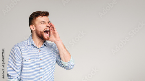 Shouting guy. Crazy emotional man screaming over grey background, panorama, free space