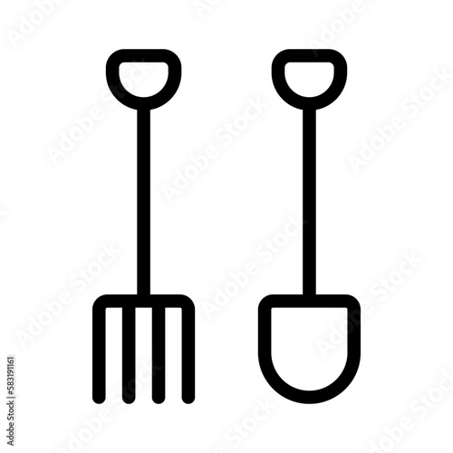 Shovel and pitchfork icon. Black contour linear silhouette. Front view. Editable strokes. Vector simple flat graphic illustration. Isolated object on a white background. Isolate.