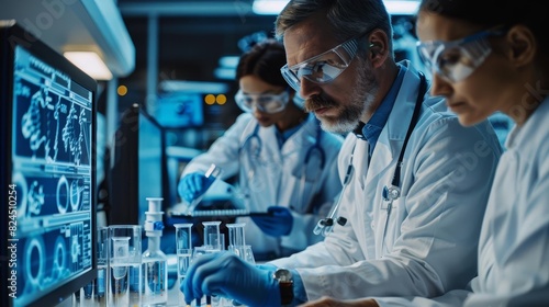 Show a team of scientists collaborating with an AI system to analyze large datasets and discover new insights in their research, Close up
