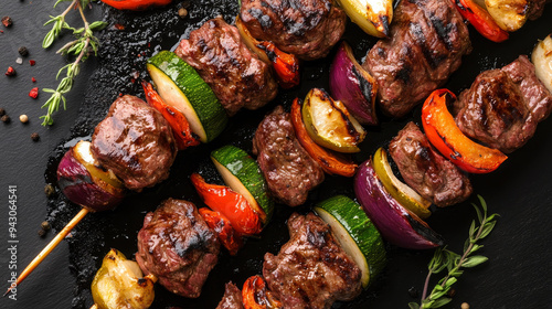 Show several skewers of kebab, each with well-grilled pieces of meat, vegetables, and perhaps garnished with herbs or spices. The kebabs should be arranged in an appetizing manner