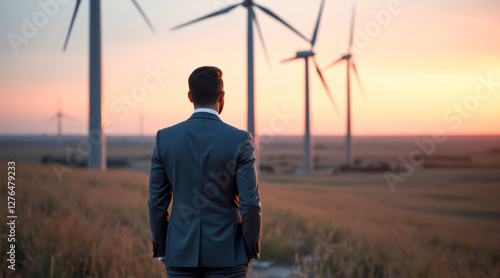 showcases a businessman in a suit standing in a field gazing at wind turbines during sunset. warm golden light bathes the scene creating a calm and contemplative mood.