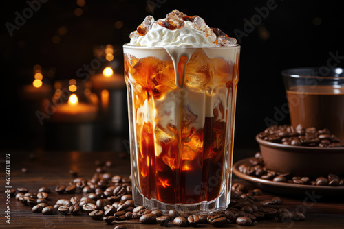 Showcases a splash of iced coffee with milk in a tall glass on a dark wood background. Represents the refreshing concept of a summer drink. Generative Ai.