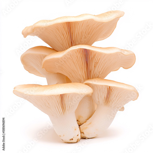 Showcasing a cluster of fresh oyster mushrooms grown in an indoor garden perfect for culinary use on white background