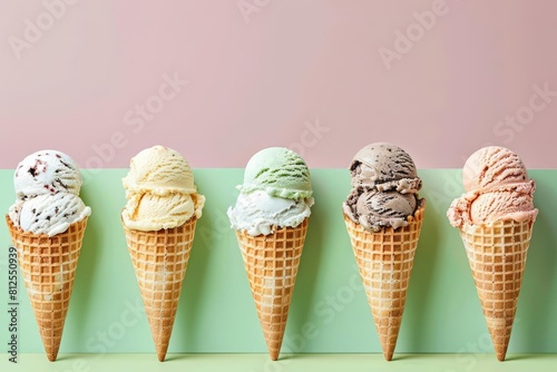Showcasing a variety of ice cream in waffle cones against a bright backdrop, with solid background and copy space on center for advertise
