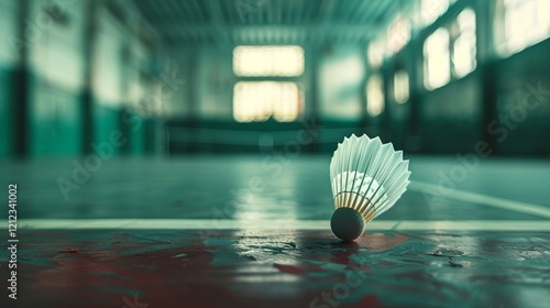 Shuttlecock lying on floor of old indoor court image copy space, ai generated. Professional badminton training inventory banner background blurred. Playing court game concept photography copyspace