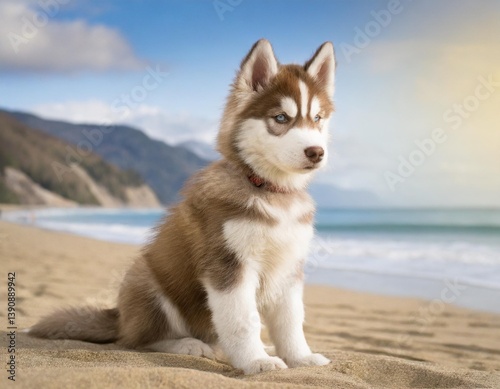 Siberian husky puppy sitting in the sand at beach in a sunny day
