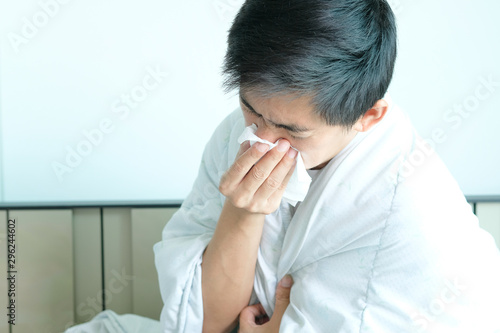 Sick man is flu, using a paper napkin and he have a runny nose. And he was covered in warm cloth.Health concept