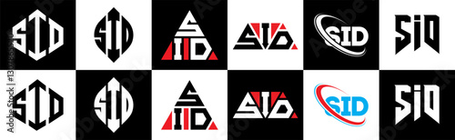 SID letter logo design in six style. SID polygon, circle, triangle, hexagon, flat and simple style with black and white color variation letter logo set in one artboard. SID minimalist and classic logo