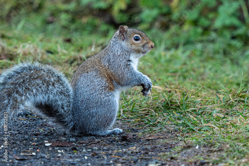 side portrait of one cute grey squirrel with fluffy fur sitting on a paved walkway in the park