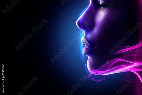Side profile of a woman's face with pink neon light effects, against a dark background
