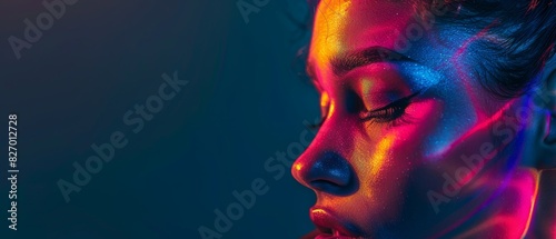 Side profile portrait of a woman illuminated by vibrant neon lights, creating a colorful and dynamic visual effect.