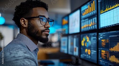 Side view of a cloud data analyst integrating complex data sets on a cloud platform, modern office with neon blue lighting, multiple screens displaying cloud-based data dashboards,