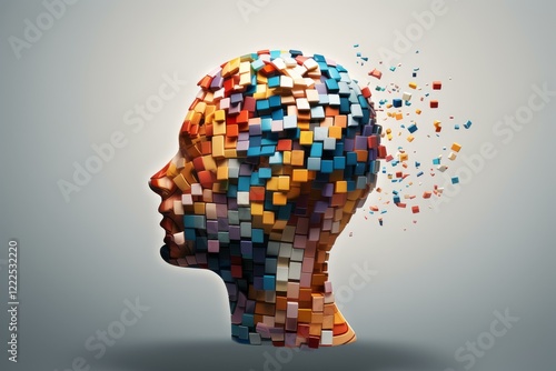 Side view of a colorful pixelated head dissolving into small cubes, symbolizing artificial intelligence and memory loss
