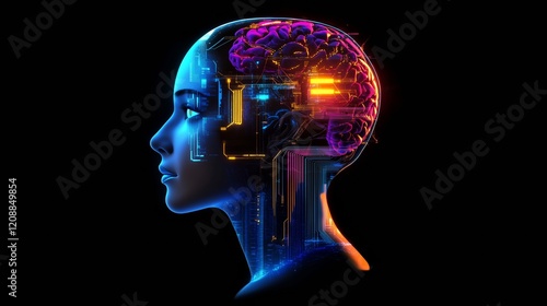 Side view of a humanoid head with blue and yellow eyes and vibrant neon neural network, representing futuristic technology and artificial intelligence. Generative AI