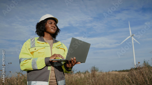 Side view of charming African American woman holding light laptop with one hand. Working comfortably with one hand in middle of open field. Power plant worker recording data. Sunny weather.
