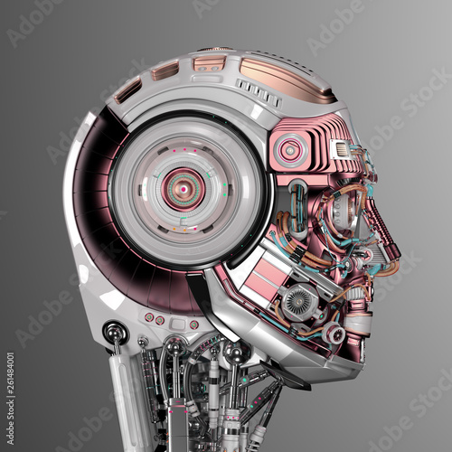 side view of the futuristic robot head or very detailed cyborg. Isolated on grey background. 3d render