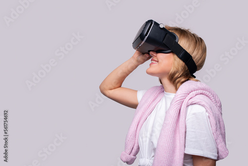 Side view photo of pretty elegant woman using VR goggles playing 3D game, isolated over white background with copy space. Modern technology. Digital technology