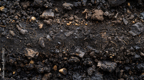 Side view photograph of rich, dark soil, slightly moist with small pebbles and organic matter, taken with a macro lens for high detail, natural lighting, photorealistic quality