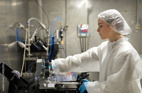 Side view portrait of young female worker operating equipment while working at factory, copy space