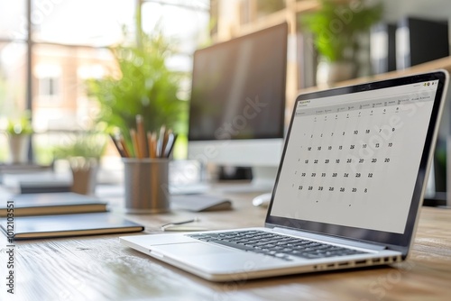 Side view shot in pastel colors of office workplace table with laptop displaying calendar page, notebook and computer monitors in background, focus on, Generative AI